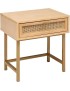 Fabricada em madeira clara, a mesa de cabeceira "Rayo" assenta numa base de metal com acabamento em latão, conferindo-lhe um toque sofisticado. O puxador da gaveta, com a sua frente em rattan, complementa este detalhe elegante.